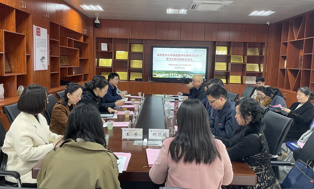 为深入学习贯彻党的二十大精神,开展“深学争优、敢为争先、实干争效”行动,进一步加强人才培养、专业建设、学科发展、课程建设等方面的交流合作,2023年3月28日,福建医科大学基础医学院党委书记郭松斌、院长陈婉南一行6人来校走访交流并开展访企拓岗促就业活动。教务处负责人李淼淼、医学院党政领导班子、临床医学专业带头人及专业教师、基础医学相关教研室主任及专业教师代表参加交流会议,会议由医学院党总支书记邱滚忠主持。