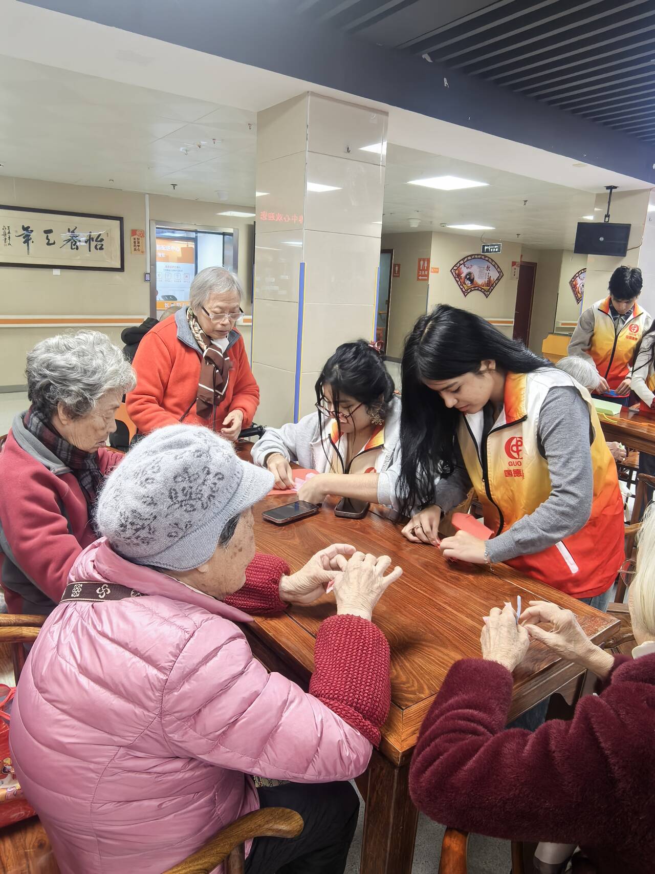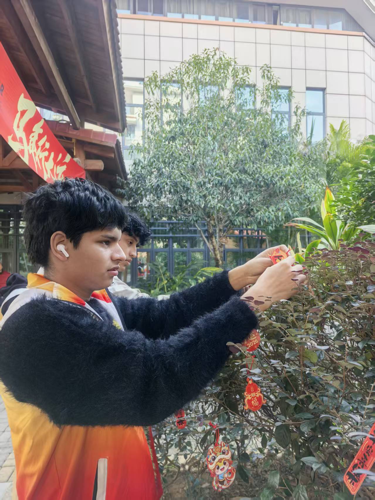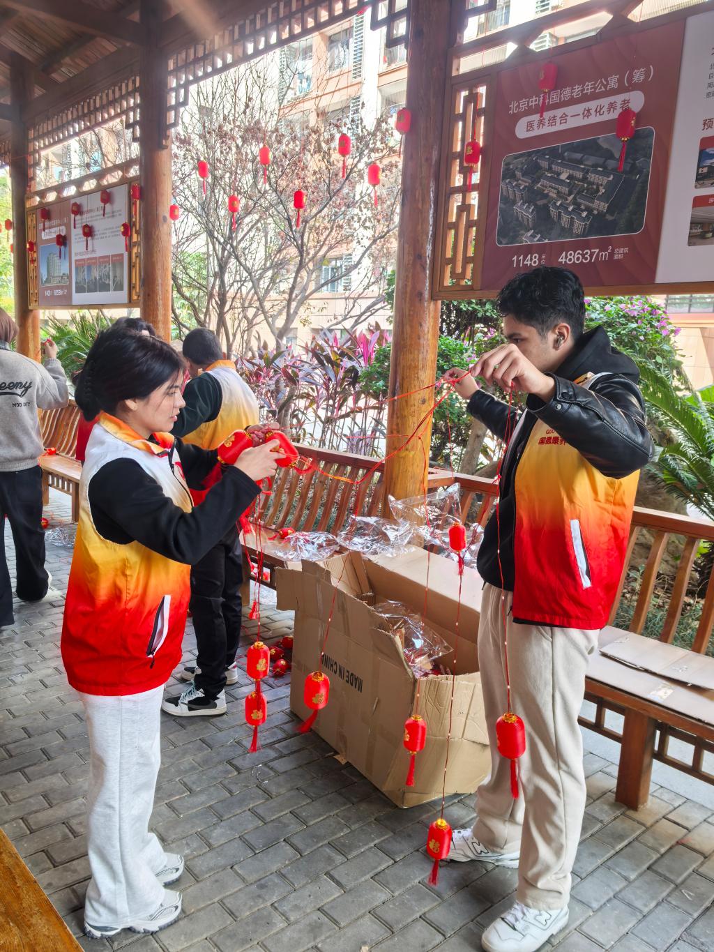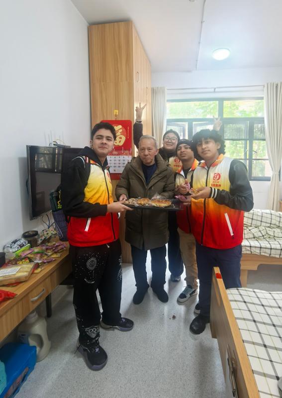 在志愿服务期间,留学生们深度参与了中国传统节庆文化活动,亲身感受中国文化的独特韵味。立春当日,他们精心编排了灵动的手势舞,与长者们暖心互动。除夕前夕,他们忙碌地挂灯笼、贴福字,将康养中心装点得年味十足。春节前,他们多次入户,用刚学会的中文向长辈们拜年:“新春快乐,身体健康!”