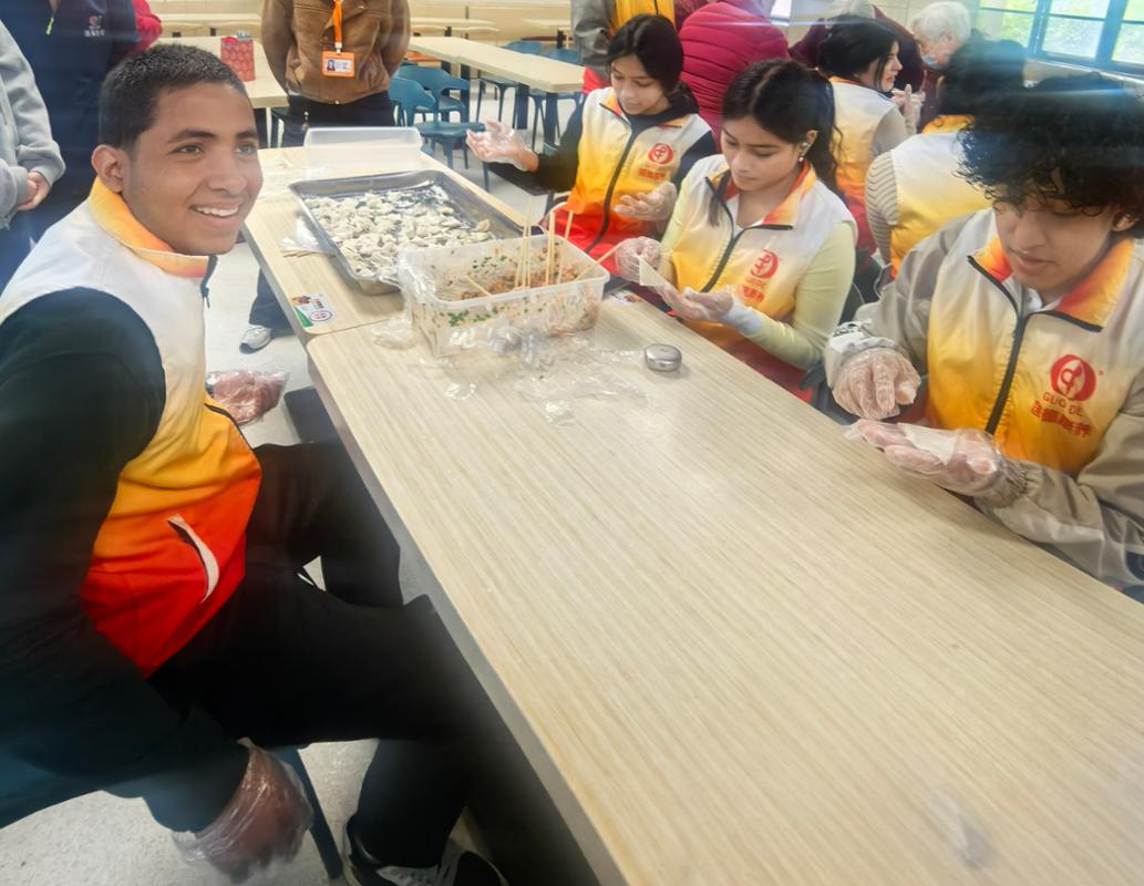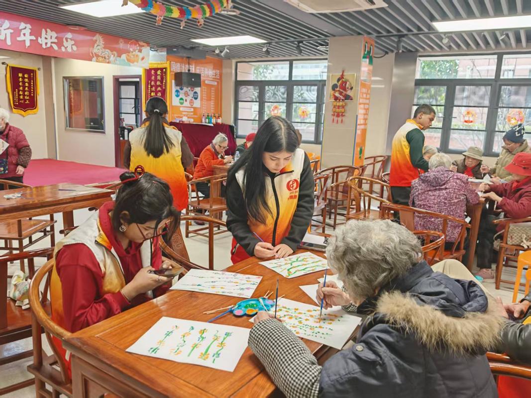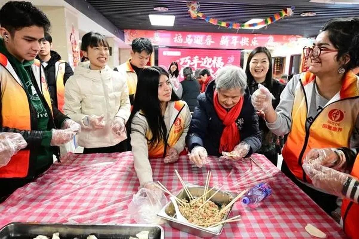 初入康养中心时,语言沟通障碍与文化习俗差异让留学生们略显拘谨。然而,仅仅半个月的时间,留学生们便迅速适应了新角色。每天清晨8点,他们准时出现在长者身边,陪伴着做早操、练习八段锦,认真模仿着每一个动作,一招一式虽略显稚嫩,却饱含真诚。手工课上,他们与长者携手共绘迎春花、手折纸蝴蝶,指尖翻飞间传递着创意与温情。在赶集活动中,他们化身“摊主助手”,帮忙叫卖商品,那充满活力的吆喝声此起彼伏,与欢笑声交织在一起,让集市更加热闹非凡。小年包饺子时,他们从最初笨手笨脚地“捏破面皮”,到后来能够独立包出饱满圆润、形似元宝的饺子,收获了爷爷奶奶们的一致点赞,脸上洋溢着自豪的笑容。