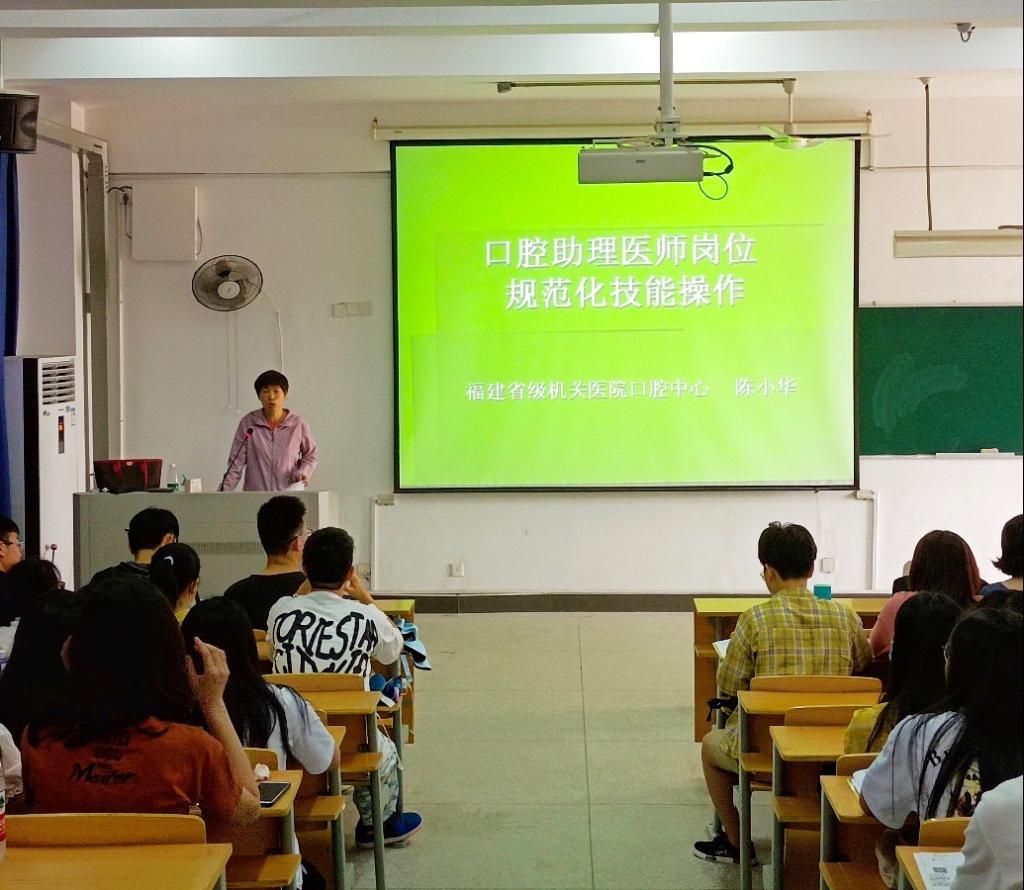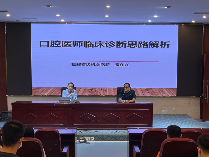 5月23日,应医学系邀请,附属医院福建省级机关医院副院长、国际牙科医师学院院士(ICD)、福建省口腔质量控制中心副主任潘在兴教授,附属医院口腔中心副主任陈小华主任医师到校为即将毕业的2018级口腔医学专业学生分别做了《口腔临床医师诊断思路解析》、《口腔助理医师岗位规范化技能操作》专题讲座,医学系邱滚忠书记、林国威副主任、林浩副主任、口腔教研室全体教师也一起到场聆听了报告。