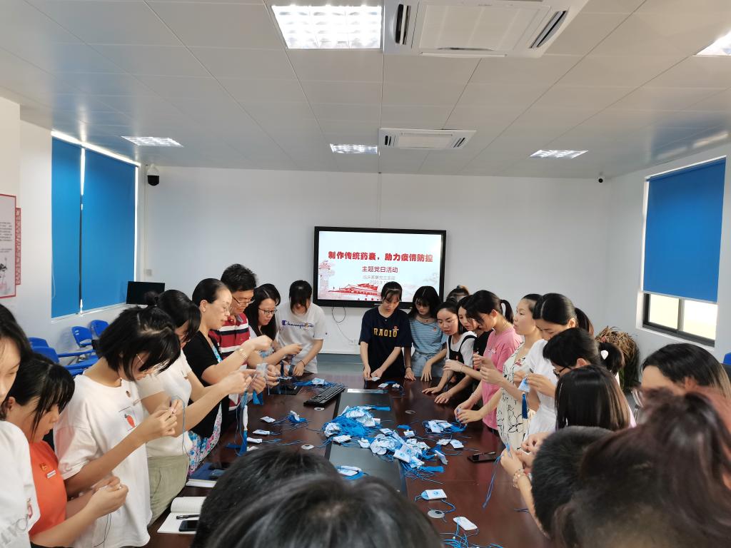 活动中,支部全体师生分工合作,有条不紊,制作了数百个具有“芳香辟秽、祛邪解毒”防疫效用药囊,会议室弥漫着清新怡人的中药香。