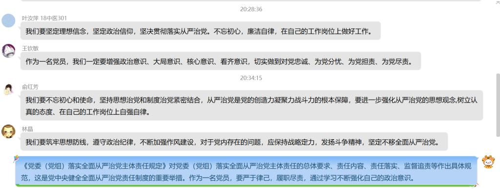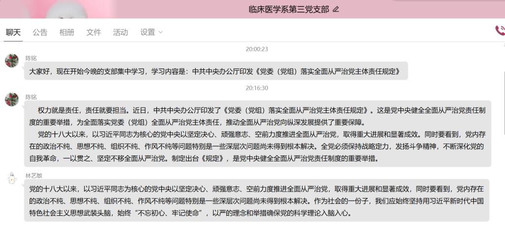5月10日晚,临床系第三党支部于通过支部QQ群召开线上学习活动,此次学习内容为《党委(党组)落实全面从严治党主体责任规定》(以下简称《规定》),由支部书记陈铭同志主持。
