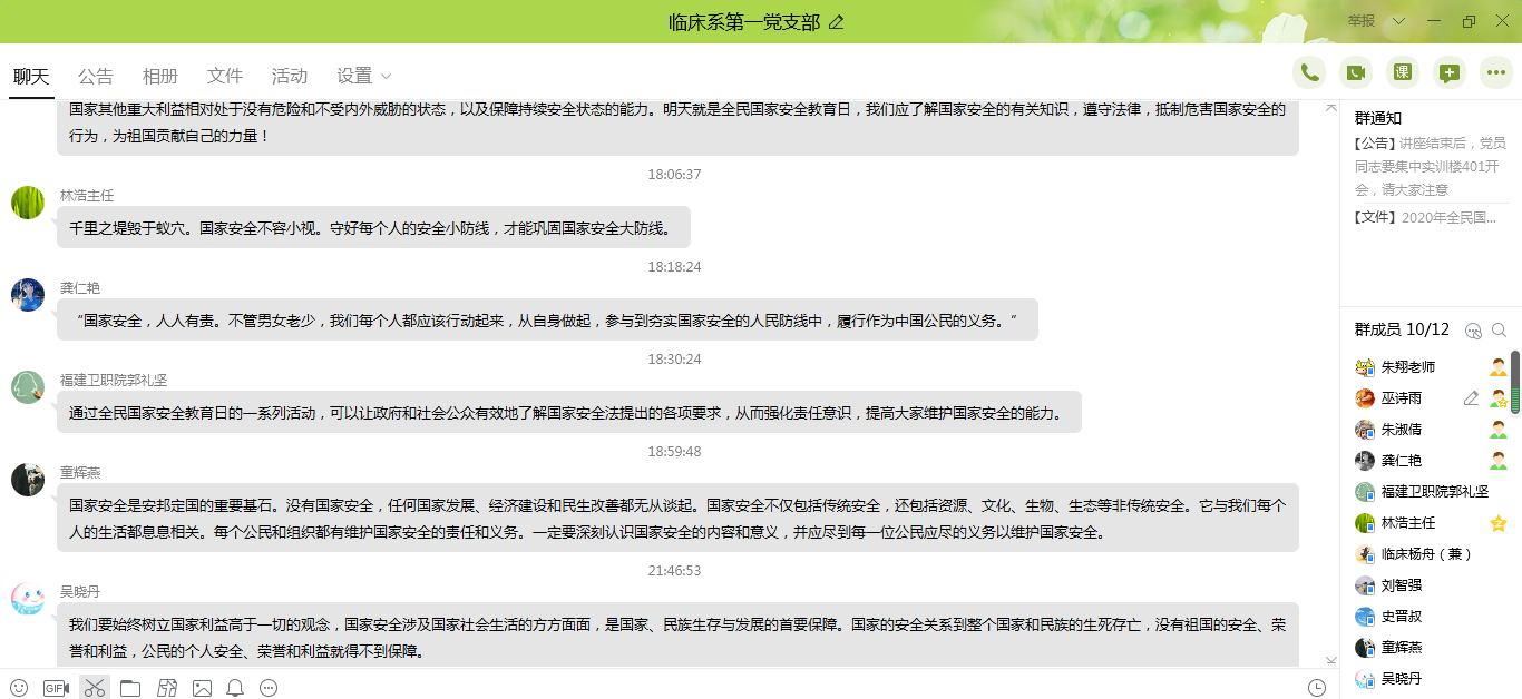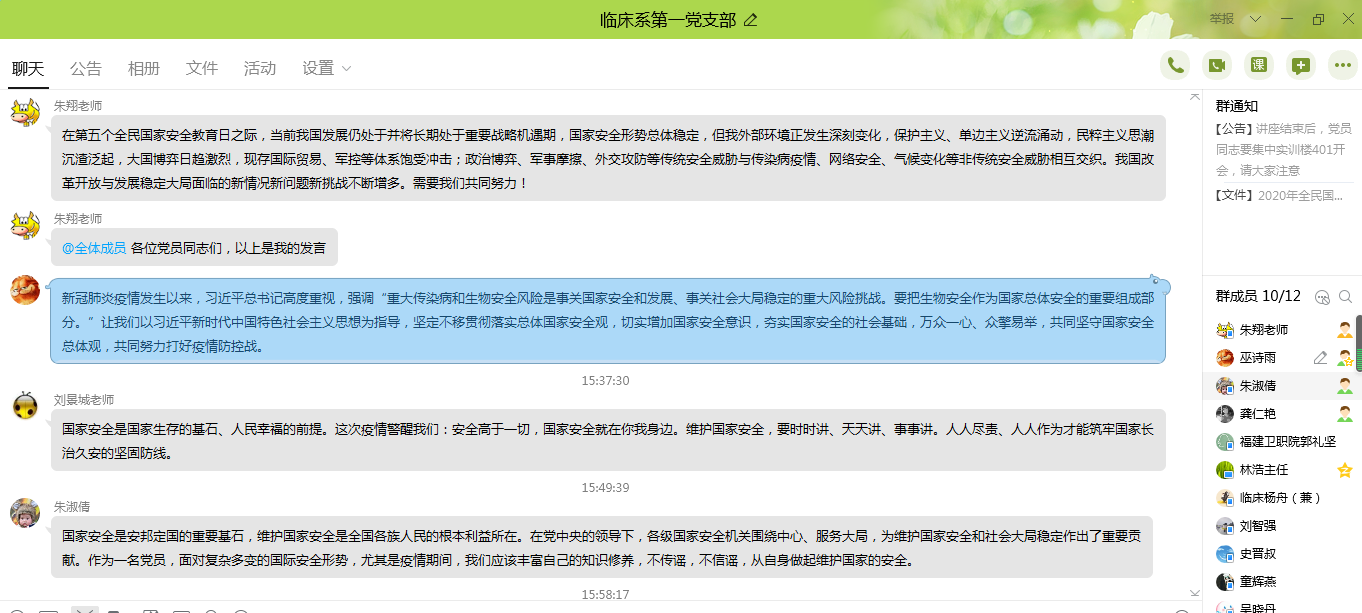 今年4月15日是第5个全民国家安全教育日,今年的主题是“坚持总体国家安全观,统筹传统安全和非传统安全,为决胜全面建成小康社会提供坚强保障”。为深入学习理解习近平总书记提出的“总体国家安全观”,提高全员维护国家安全的意识。4月15日,临床系第一党支部开展“国家安全教育日”主题党日活动,此次活动由支部书记朱翔同志主持,支部全体党员参加。