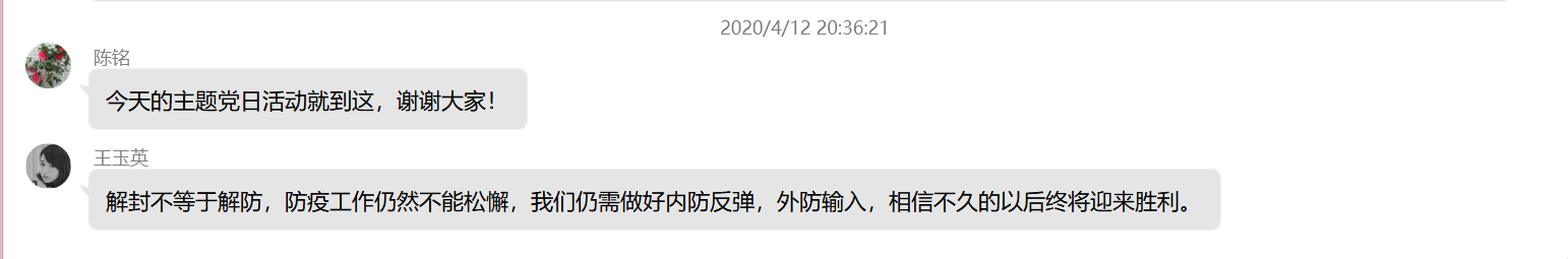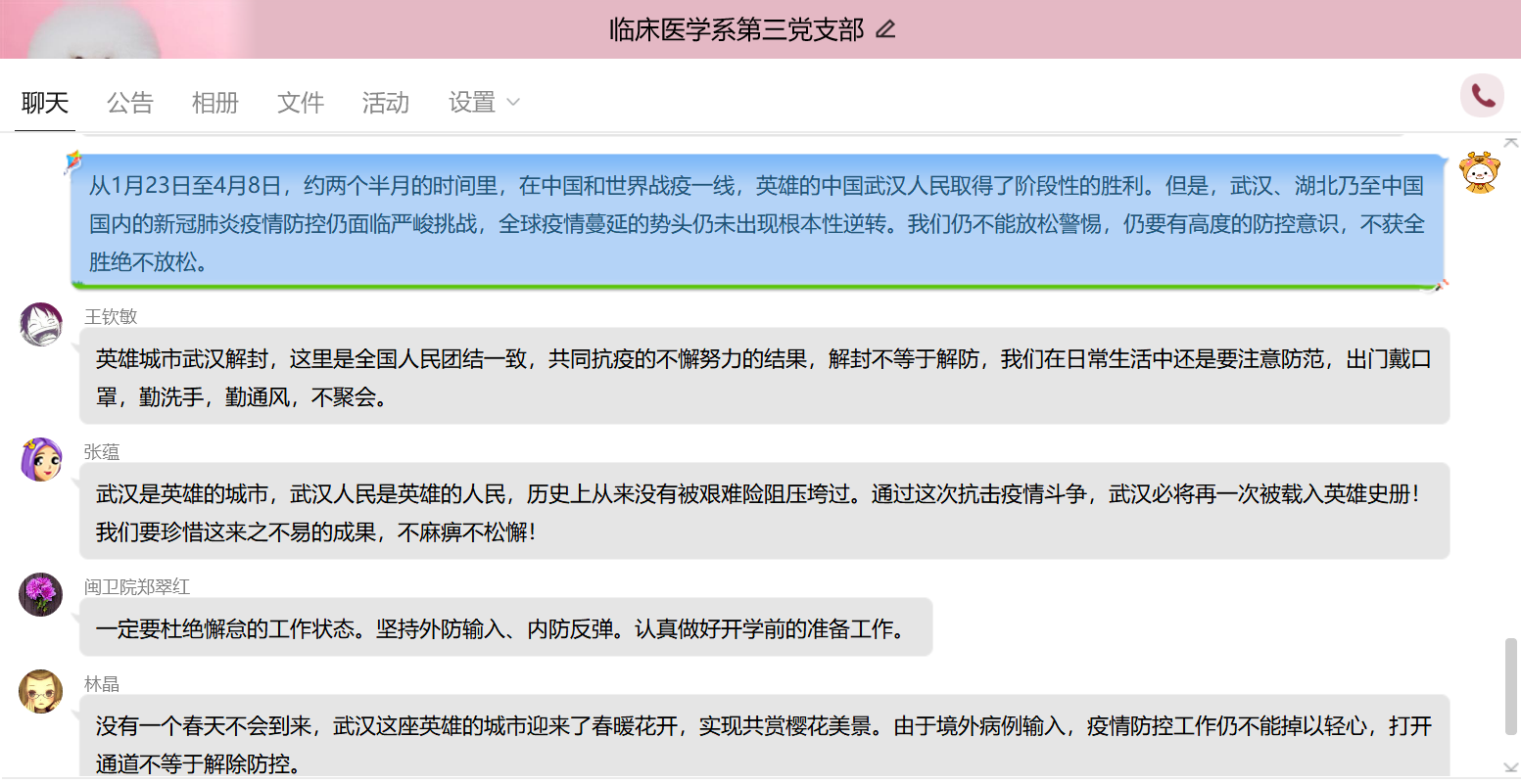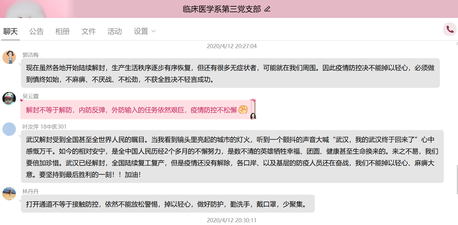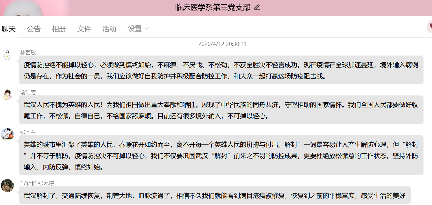 为更好地组织支部党员学习,发挥党员的先锋模范作用。4月12日晚上,临床医学系第三党支部开展学习《武汉战“疫”日历》、《慎终如始 防控不松——写在武汉市解除离汉通道管控之际》、《打开通道不等于解除防控》等相关新闻报道的主题党日活动,此次活动由支部书记陈铭同志主持,支部全体党员及预备党员均参加。