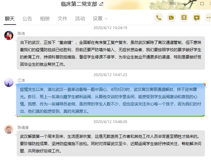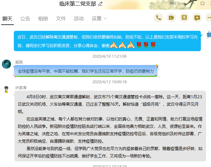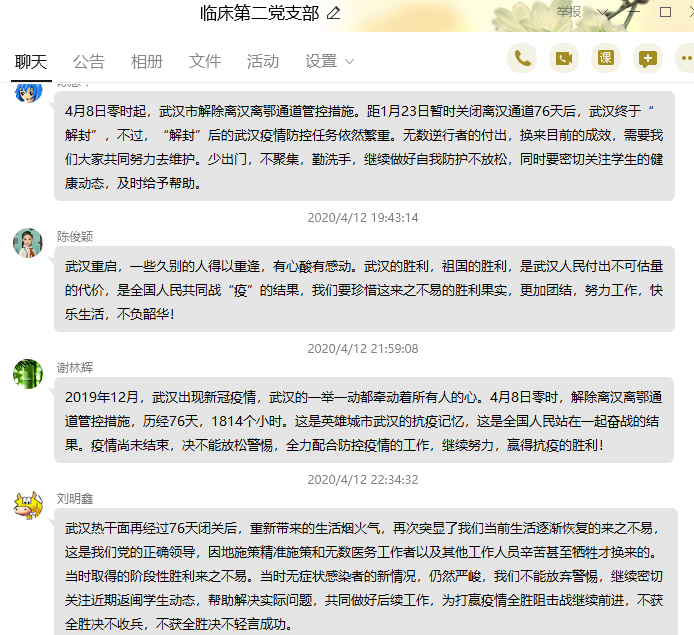 2020年4月12日,临床医学系第二党支部组织全体党员在线学习,关于武汉解除管制措施,一起回顾了关闭离汉通道76个日日夜夜武汉人民的默默坚守和勇敢付出,和战疫期间一线工作英雄们的先进事迹,以及关闭离汉通道76天后,积极战疫取得阶段性胜利的第一周,逐步苏醒的武汉烟火气等,展开交流学习。党员同志们积极发表自己的见解,就当前国际疫情形势仍然严峻的情况下,工作开展应该注意的事项进行交流学习。