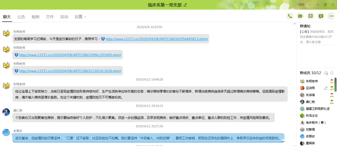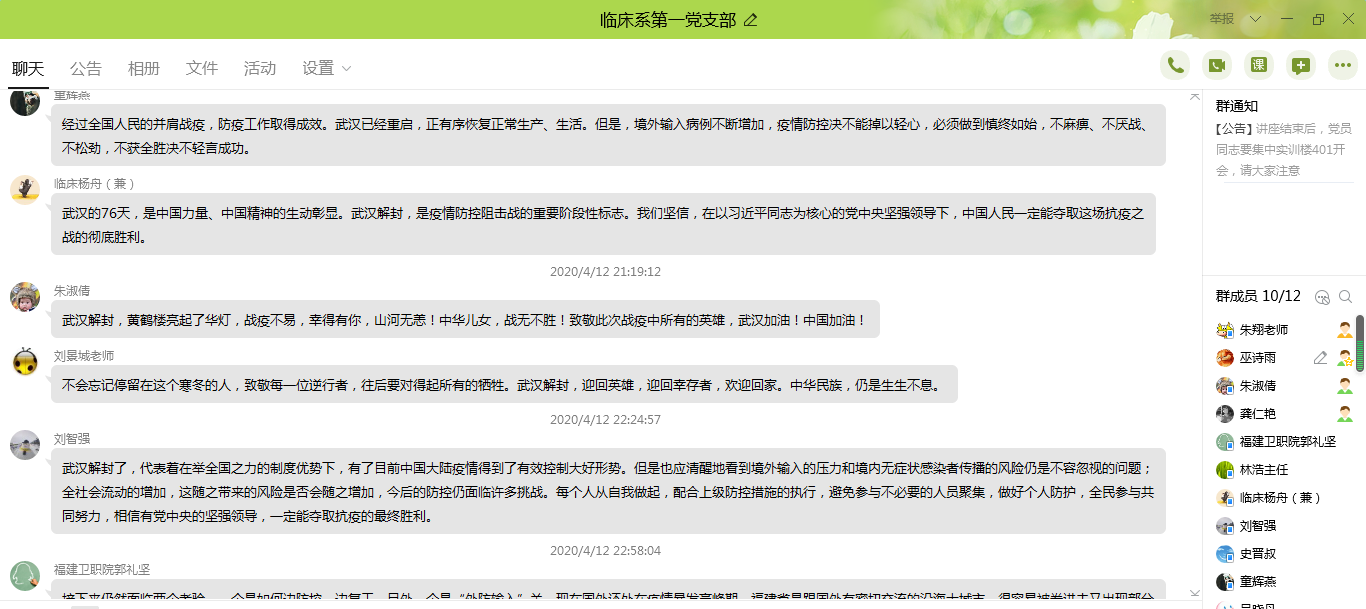 4月8日零时起,关闭离汉通道76天后,武汉市解除离汉离鄂通道管控措施。当天,临床医学系第一党支部组织在线学习了武汉解封的相关新闻和信息,并纷纷发表了自己的学习体会。