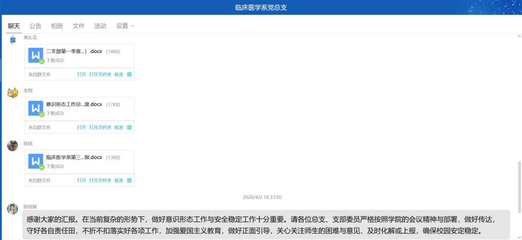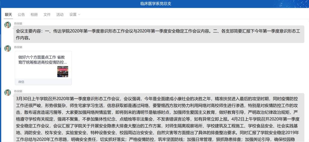 4月2日,临床医学系2020年第一季度意识形态及安全工作会议,同时4月份的党支部书记例会于线上召开。系党总支委员及支部书记参加会议,会议由党总支负责人陈俊颖主持。