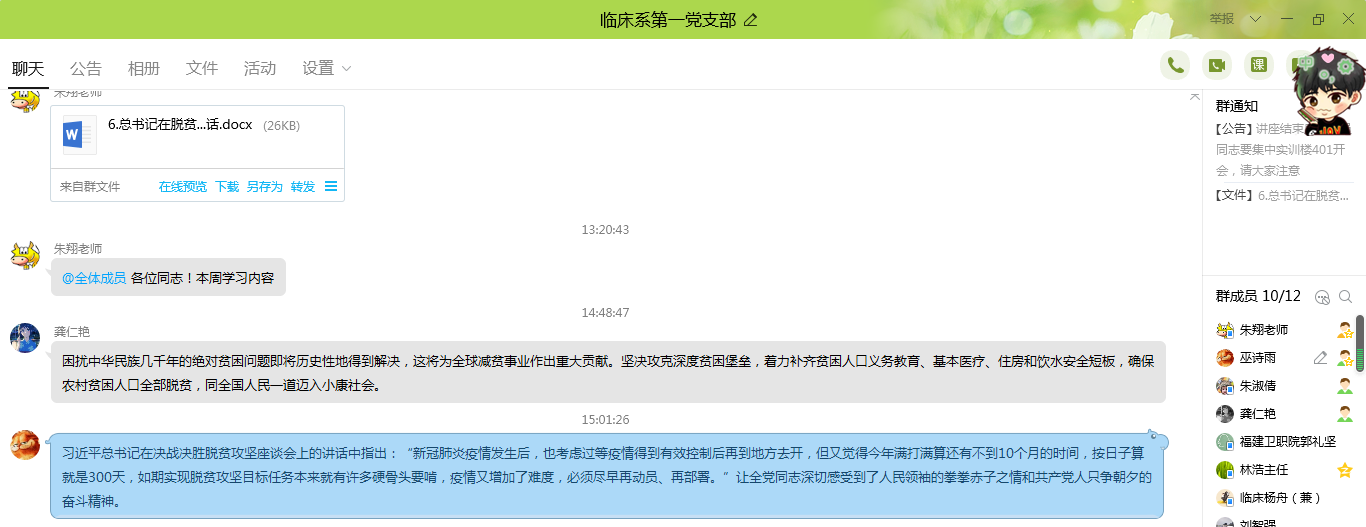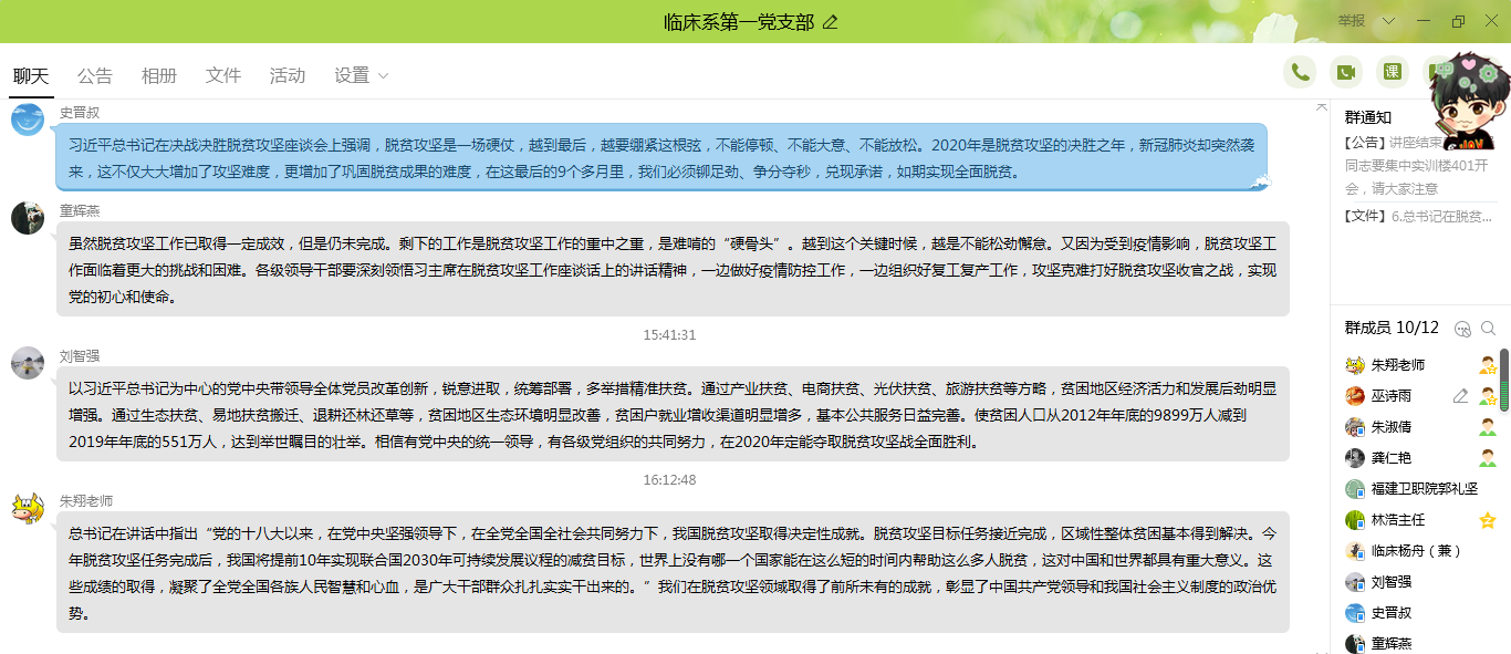 2020年3月29日下午,临床医学系第一党支部组织在线学习习近平总书记在脱贫攻坚座谈会上的讲话。习近平总书记这次的谈话分析了当前形势,克服新冠肺炎疫情影响,凝心聚力打赢脱贫攻坚战,确保如期完成脱贫攻坚目标任务,确保全面建成小康社会。党员同志们针对今天的学习进行线上讨论,并纷纷发表了各自的体会和收获。
