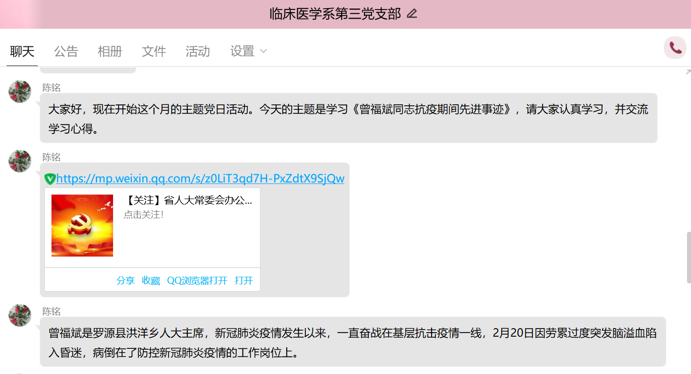 3月2日下晚上,临床医学系第三党支部利用在线平台开展“学习曾福斌同志抗疫期间先进事迹”主题党日活动。