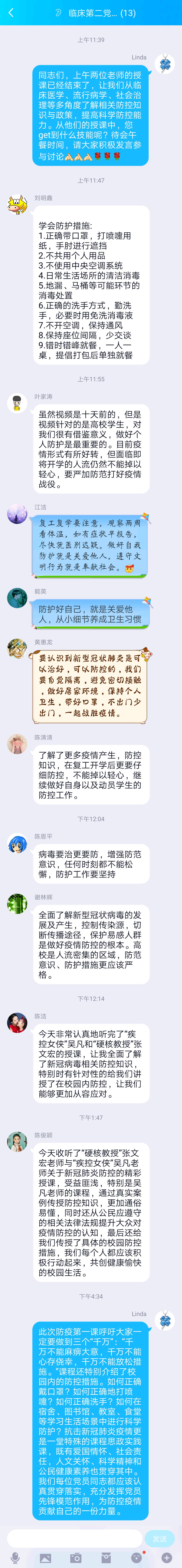 课程结束后,党员同志们针对学习纷纷发表心得体会,在线上展开讨论:陈俊颖同志表示,今天收听了“硬核教授”张文宏老师与“疾控女侠”吴凡老师关于新冠肺炎防控的精彩授课,受益匪浅,特别是吴凡老师的课程,通过真实案例传授防控知识,更加通俗易懂,同时还从公民应遵守的相关法律法规提升大众对疫情防控的认知,最后还给我们传授了具体的校园防控措施,我们每个人都应该积极行动起来,共创健康愉快的校园生活。叶家涛同志表示,视频针对的是高校学生,对我们很有借鉴意义,做好个人防护是最重要的。目前疫情形势有所好转,但面临即将开学的人流仍然不能掉以轻心,要严加防范打好疫情战役。陈清清同志表示,了解了更多疫情产生,防控知识,在复工开学后更要仔细防控,不能掉以轻心,继续做好自身以及动员学生的防控工作。谢林辉同志表示,全面了解新型冠状病毒的发展及产生,控制传染源,切断传播途径,保护易感人群是做好疫情防控的根本。高校是人流密集的区域,防范意识、防护措施更应该严格。