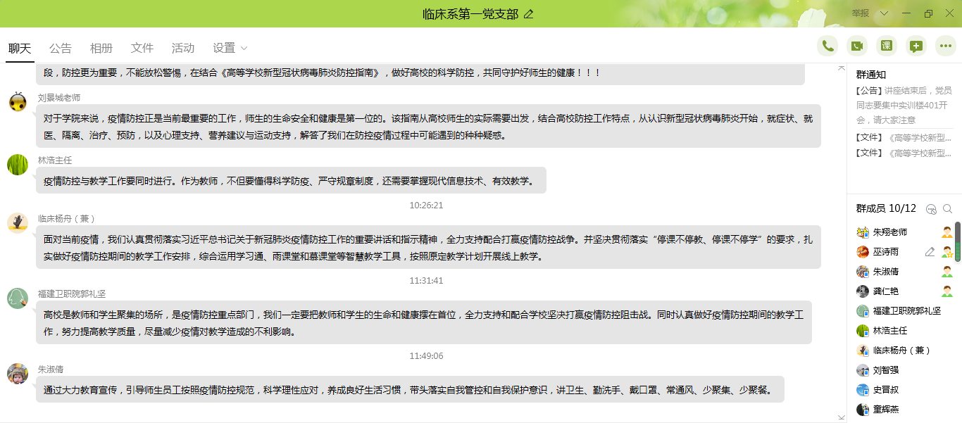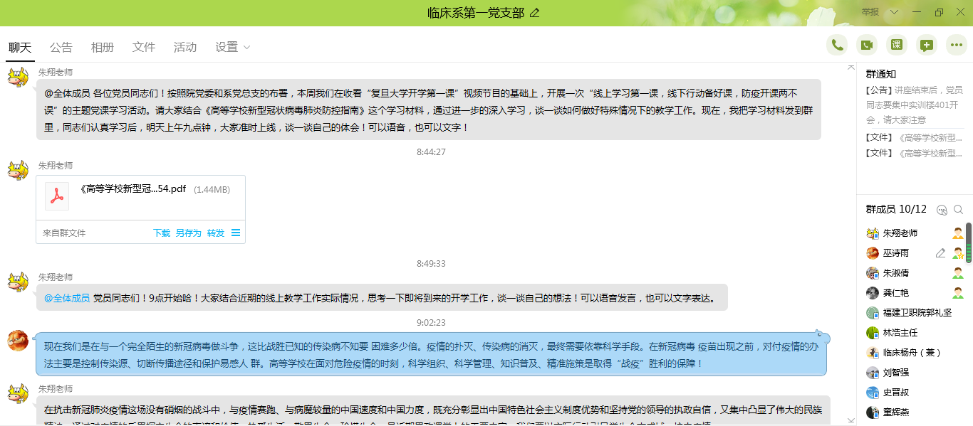 为增强支部党员党性修养,提高教师党员的责任意识。2020年2月26日,临床医学系第一党支部在学习研讨了复旦大学“新冠肺炎防控第一课”直播课程的基础上,结合《高等学校新型冠状病毒肺炎防控指南》,利用在线平台举办题为《线上学习第一课,线下行动备好课,防疫开课两不误》的专题党课。本次党课由支部书记朱翔同志主讲,支部全体党员参加本次学习。