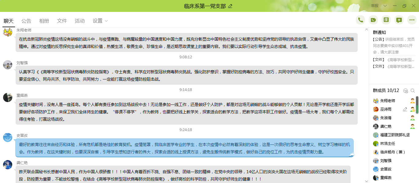朱翔书记主要从《高等学校新型冠状病毒肺炎防控指南》结合近期的线上教学工作实际情况,带领大家一起思考即将到来的开学防疫工作,以及如何提高教师党员的责任意识。我们教师党员该担负什么样的责任,该展现什么样的精神状态,该拿出什么样的实际行动,来投入这场疫情战役的洪流?教育战线的师生们,需要共同面对、共同承担、共同学习、共同参与,建立好疫情防控的统一战线,充分掌握好防控病毒的方法、技巧,守护好师生健康,守护好校园安全,在教学环境改变、教学手段创新中完成教育和学习的重任。