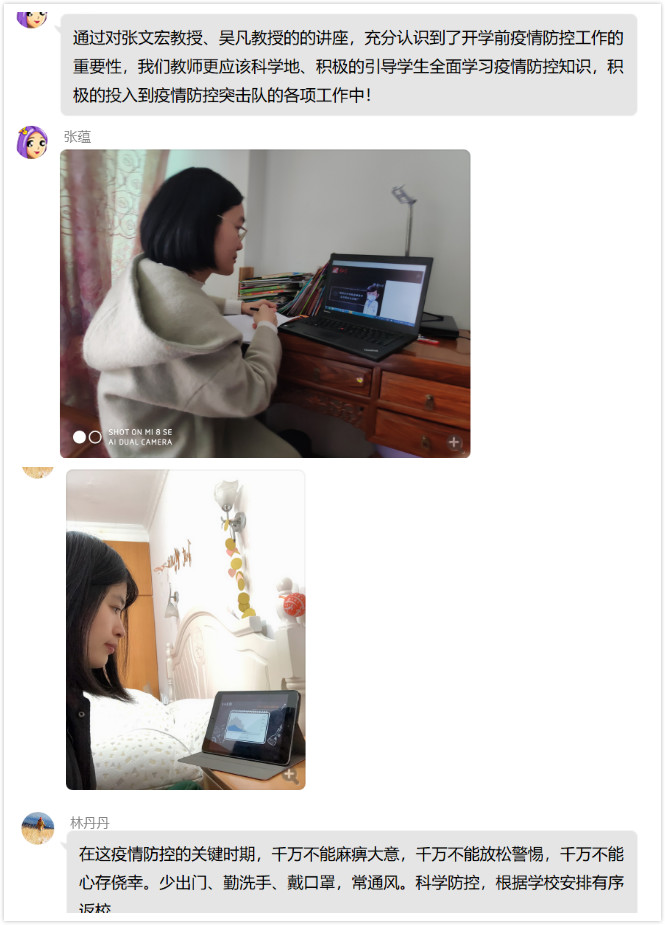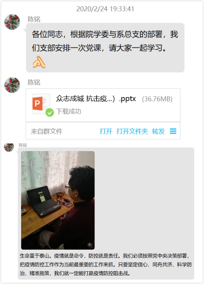 党课之后,支部党员还就今天观看的复旦大学“新冠肺炎防控第一课”进行了热烈的讨论,党员们纷纷表示,通过学习张文宏和吴凡老师精彩课程之后,更进一步了解“新冠肺炎”,也更能充分认识到当前疫情防控工作的重要性。针对校园疫情防控工作,作为一名党员,我们更应该科学地、积极的引导学生全面学习疫情防控知识,积极的投入到疫情防控突击队的各项工作中!