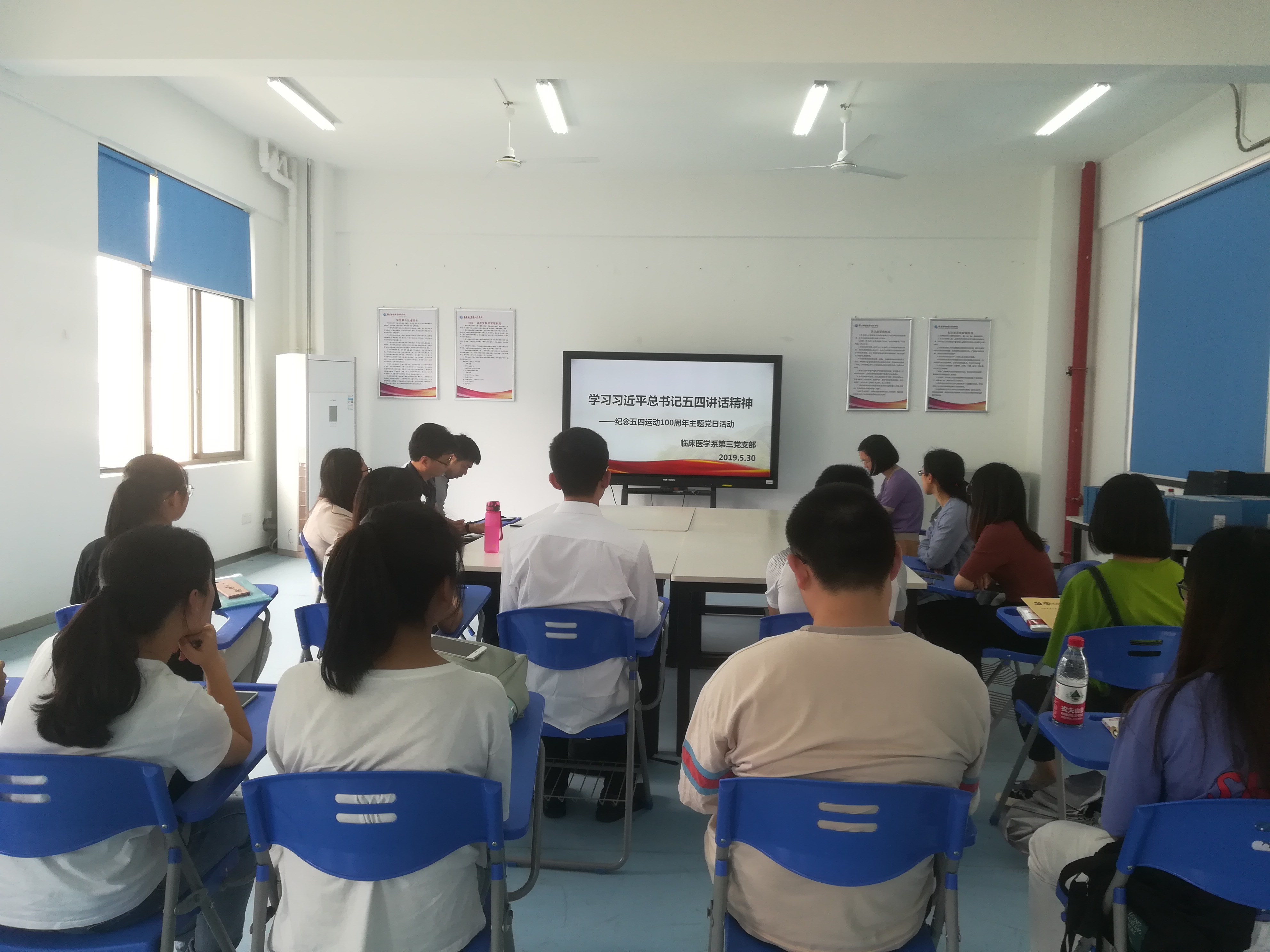 为深入贯彻落实《中共教育部党组关于教育系统认真学习贯彻习近平总书记在纪念五四运动100周年大会上重要讲话精神的通知》精神,弘扬五四精神,落实立德树人根本任务,2019年5月30日,临床医学系第三党支部组织学习了习近平总书记在纪念五四运动100周年大会上的重要讲话精神。会议由临床医学系第三党支部书记陈铭老师主持,支部党员及部分学生入党积极分子参加了本次活动。 活动首先播放了电影《建党伟业》“五四运动”片段,回顾了五四运动发生的背景与过程。影片中,一个举着血书“冤”字的女大学生跪在总统府前情愿,回答军警为什么不到检察厅喊冤时,她含泪说:“冤情太深,检察厅接不了我的状子。”之后痛呼:“我是为四万万同胞喊冤啊!”这一声犹如千钧之重的巨石狠狠砸在了每一个人的心上,与会者无不被那个热血沸腾激情澎湃的时代所震撼,被那群心系国家情牵百姓的先驱所感动,被那种为国献身死而后已的精神折服。随后,全体党员教师及学生入党积极分子共同学习了讲话全文,张蕴同志重点宣读了习近平总书记重要讲话中对青年人提出的六点希望,并结合以往教学过程中的所见所闻所感发表了对青年学生的看法和期望。接着,2018级临床301班周天阳同学代表与会学生发表学习感想,表达了青年永远高举五四精神旗帜,勇敢接力,肩负起时代重任的决心。