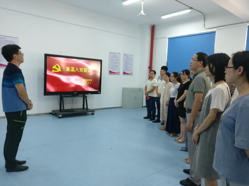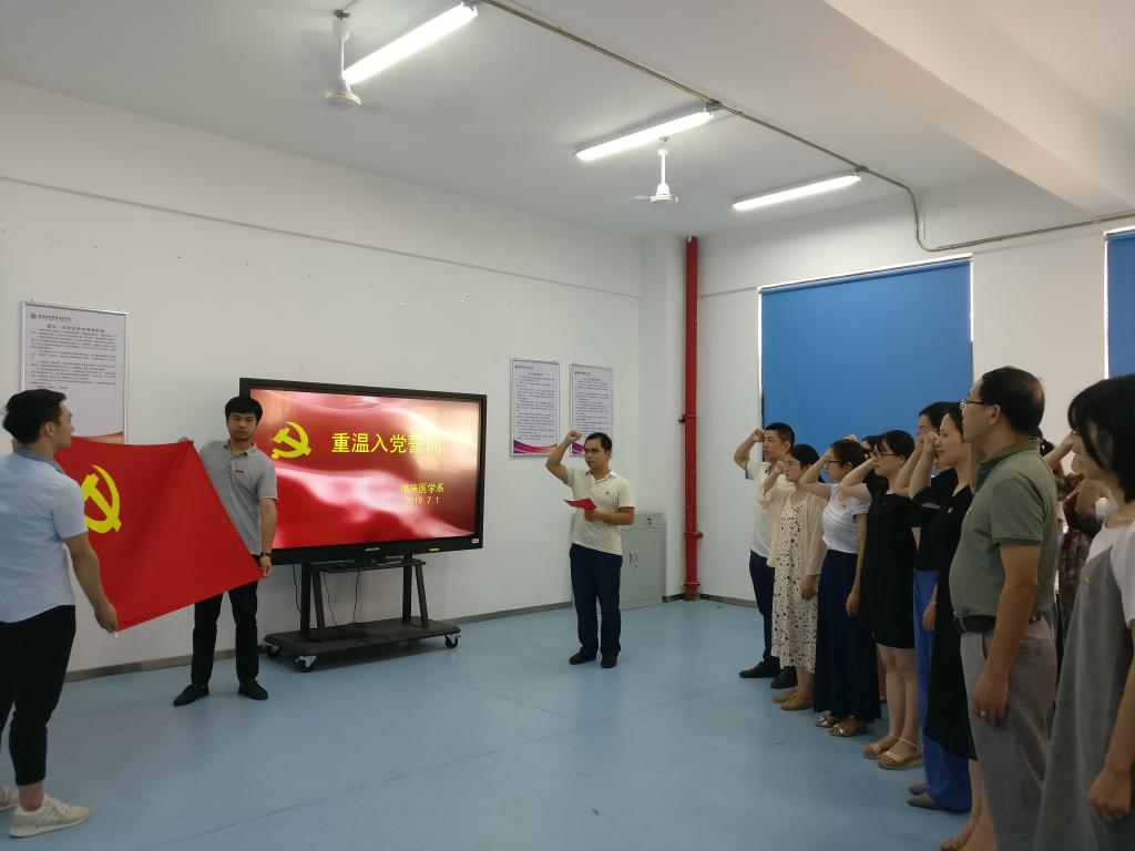 2019年7月1日,在中国共产党成立98周年之际,为进一步教育引导全体党员不忘初心、牢记使命,临床医学系第一、第二、第三党支部在实训楼401举办“重温入党誓词,牢记初心使命”主题党日活动。