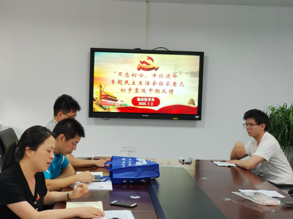 2020年7月2日,临床医学系于实训楼310召开专题民主生活会整改情况中期反馈会,会议由党总支负责人陈俊颖主持。