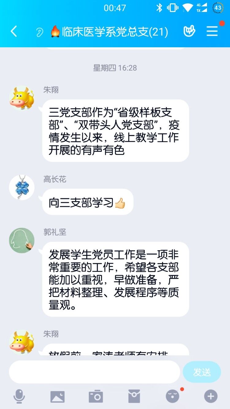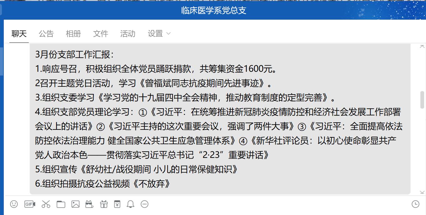 2020年3月12日,临床医学系党总支在QQ群召开2月份支部书记例会,会议由系党总支负责人陈俊颖主持。