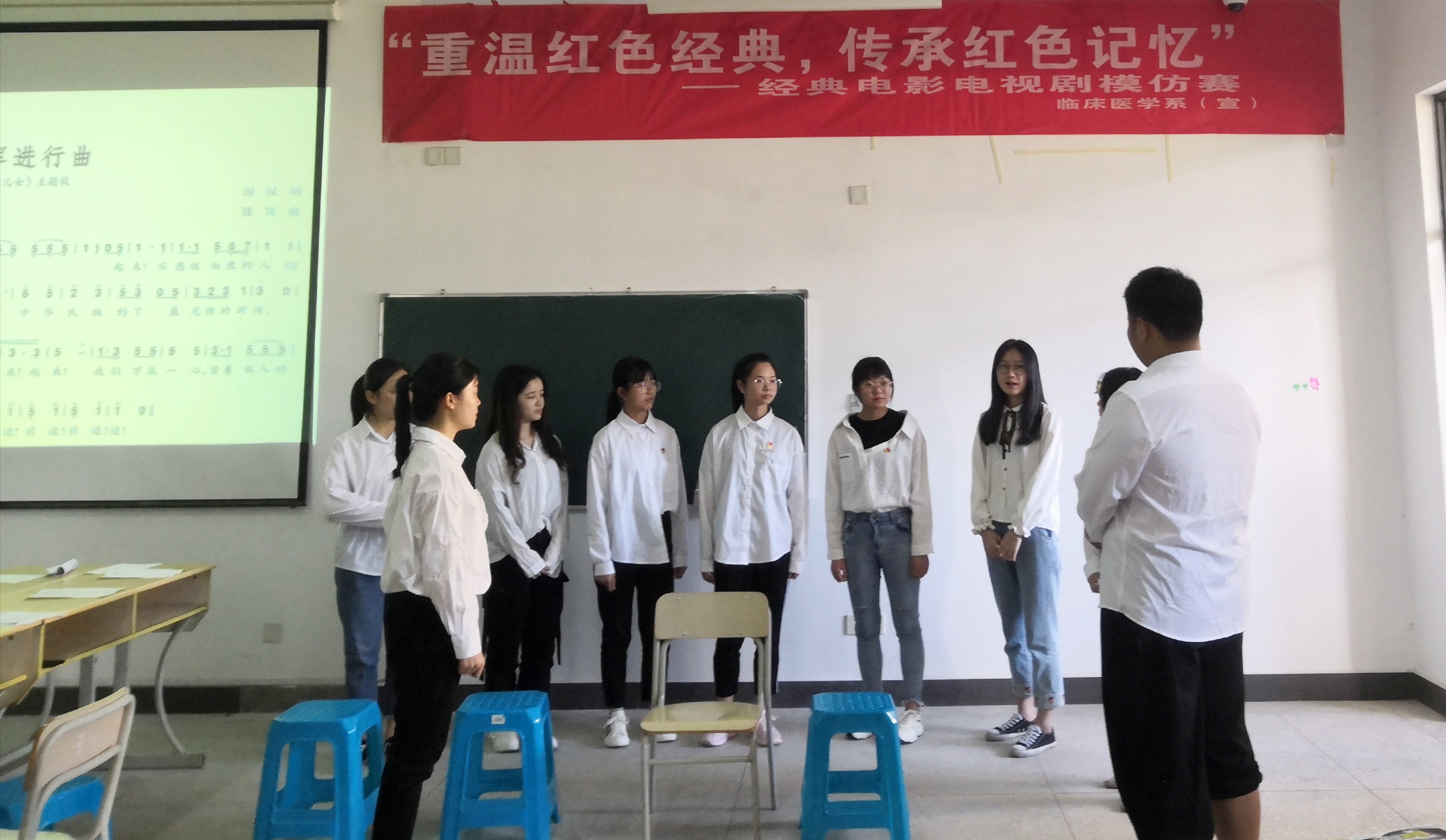 为庆祝中华人民共和国成立70周年和五四运动100周年,加深同学们对红色文化的理解、激发同学们的爱国情怀,营造出积极向上、健康文明的校园文化气氛,临床医学系于2019年5月30日在实训楼208举办重温红色经典,传承红色记忆——临床医学系举办红色经典电影模仿大赛。系团总支副书记谢林辉、辅导员刘明鑫及2018级全体团学干部担任了此次活动的评委。