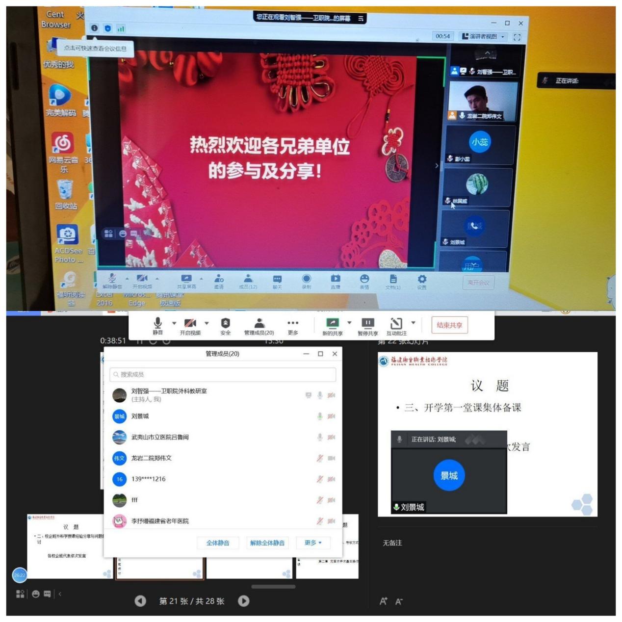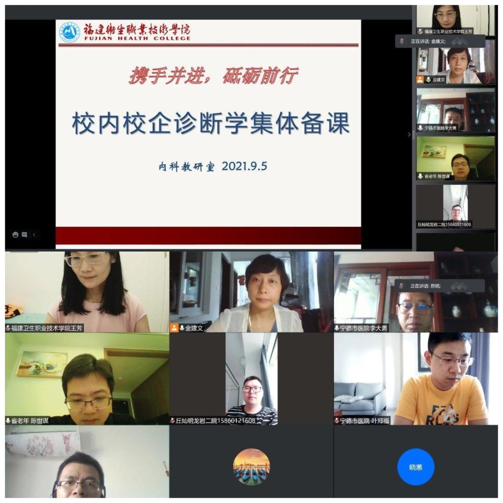 为严把教学质量关,搭建校内校企桥梁,共同提升教学质量,做好教学同质化管理,2021年9月5日下午3点,医学系内外科教研室的老师们联同六所校企合作医院,即福建省老年医院、龙岩市第二医院、安溪县医院、宁德师范学院附属宁德市医院、邵武市立医院以及武夷山市立医院在线上通过腾讯会议开展了集体备课。此次会议分为诊断学、外科学两个分会场。