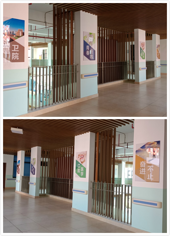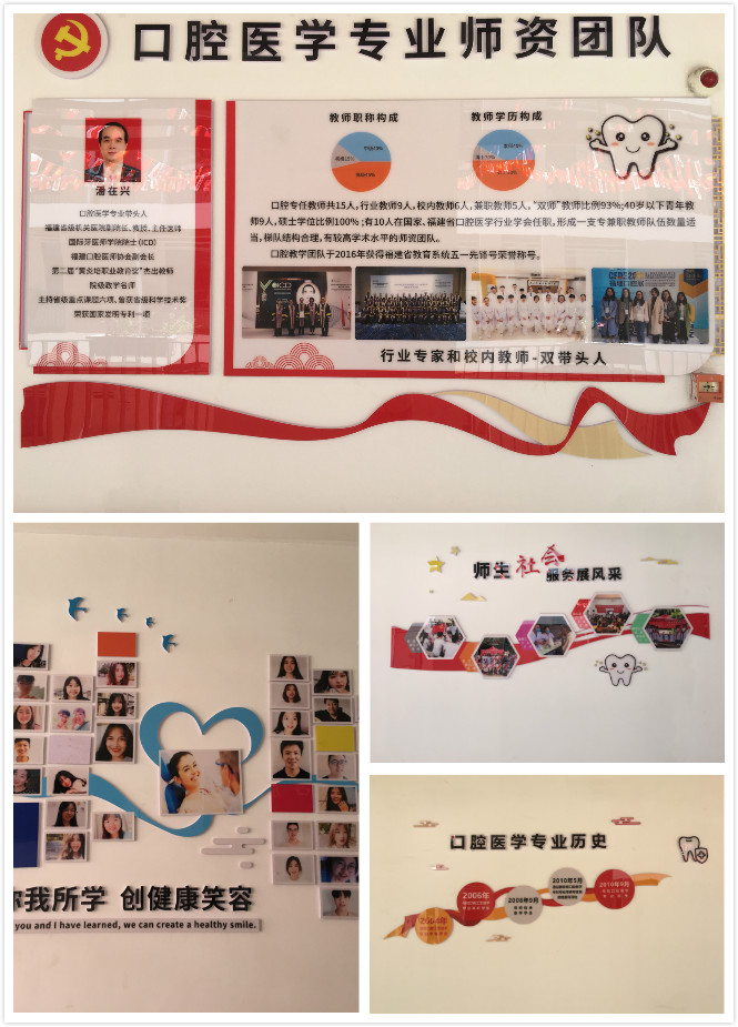 口腔医学专业实训基地于2020年7月搬入位于学院门诊部二楼的新址,总面积达700平方米,拥有口腔综合实训室、口腔修复工艺室、口腔模拟诊室、口腔X光室、门诊部口腔科等6个体现实训教学场景与临床工作环境相融合口腔医学专业校内实训场所,设备总值500万。为更还好凝练专业特色,促进专业发展,结合今年科普周活动,口腔医学专业师生如火如荼开展了口腔医学专业实训基地墙面的文化建设,共完成五个系列:专业历史、专业师资团队、社会服务、竞赛之路、口腔科独具特色的“微笑墙”。赋予了专业文化底蕴的口腔医学专业实训基地建设将在科学规范的管理下进一步完善,全力打造集产、学、研一体化的数字化现代口腔医学实训基地,为完成口腔医学专业技能型人才的教学目标提供了坚实的基础。