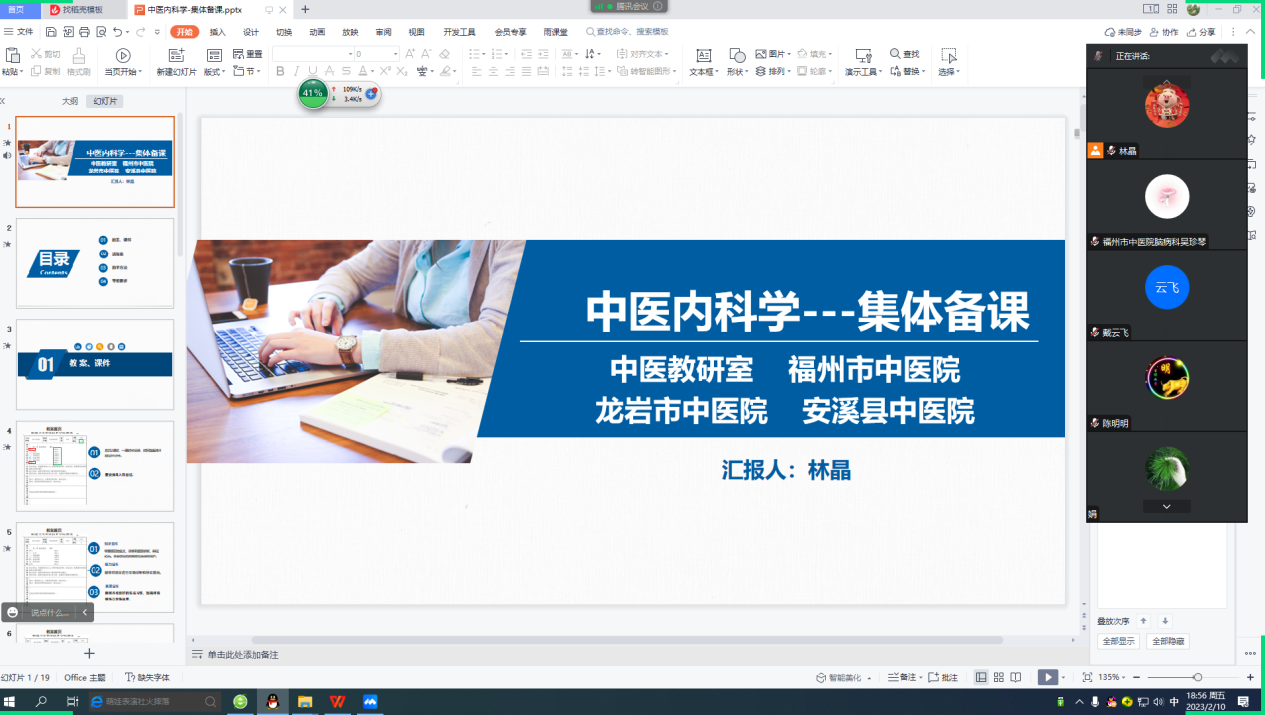 为搭建校内校企桥梁,严把教学质量关,共同提升教学质量,做好同质化管理,2023年2月10日晚7点,根据中医学、针灸推拿学专业本学期课程内容,由中医教研室牵头,对《中医内科学》、《中医外科学》、《中医妇科学》、《中医儿科学》、《针灸学》、《急救医学》几门课程开展集体线上集体备课,由各课程负责人主备,联同福州市中医院、龙岩市中医院、安溪县中医院三所校企合作单位,分为6个分会场,在腾讯会议中开展了集体备课。会议中依托执业助理医师考试大纲,主要针对教材、教案、课件、进程表、教学方法、考核方式等内容进行交流讨论。校企医院的教师代表针对以上问题进行深入探讨,积极提问并发表意见,最终各门课程进程表将逐步优化,提高了对教学材料的规范性认识,对课程内容、教学方法以及思政育人目标有了进一步认识。