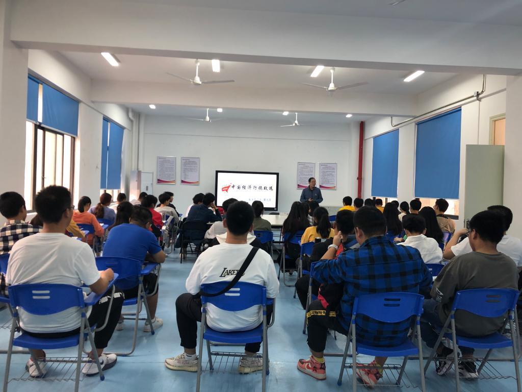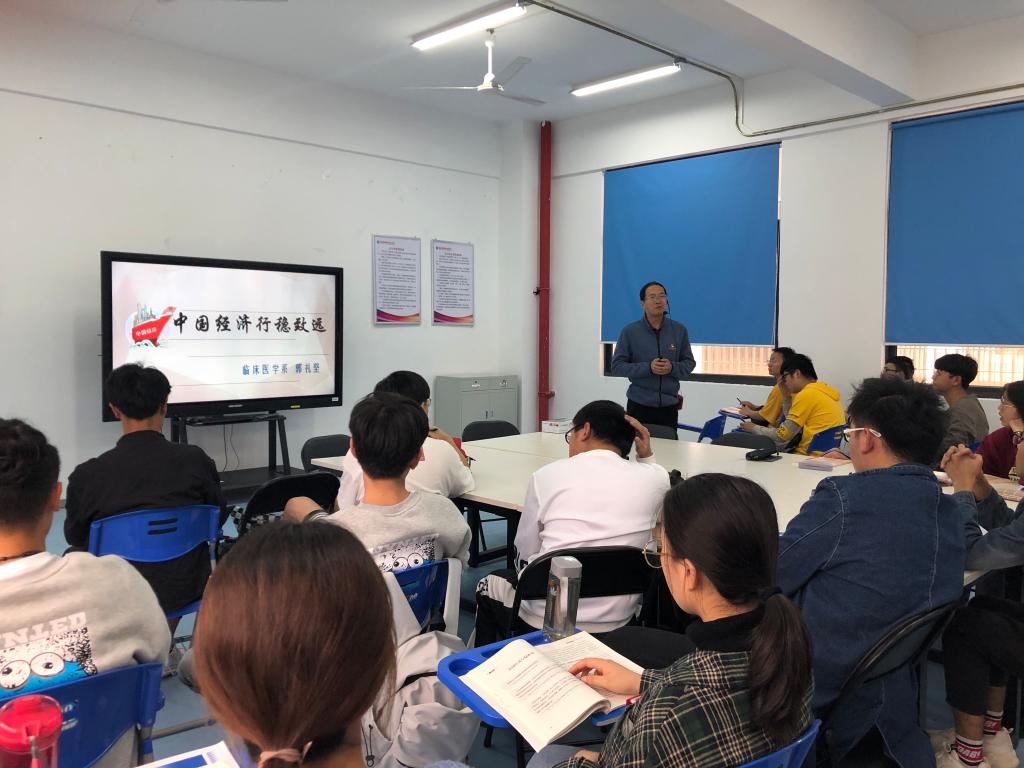 形势政策课以《中国经济行稳致远》为题,分为四个部分,分别是“总体平稳,主要预期目标较好完成”、“稳中有进,转型升级蹄疾步稳”、“稳中有变,正确看待风险与挑战”和“长期向好,我国发展仍处于重要战略机遇期”。郭主任用详实的数据和形象的图片阐述了中国经济平稳的总体格局和未来的变数以及遭遇的挑战,中国经济航船乘风破浪行稳致远。