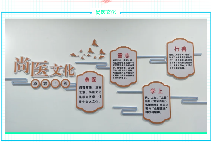 尊医:有尊崇、注重之意,尚医文化是崇尚医学,注重生命之文化。我系自创办以来便立志于培养医学生高尚的人文品质。作为一名医生应具备敬畏生命、尊重生命规律、懂得倾听、尊重患者、善解人意、敢于冒险的品格,要有一颗仁爱之心和一双温暖的手。医务工作者要在先进文化和崇高医学人文精神的涵养下,正确认识医学与人文的关系,树立“以人为本、以德行医、以医行善”的观念,进一步弘扬“崇尚敬业,崇尚奉献,崇尚服务,崇尚创新”的医院精神。