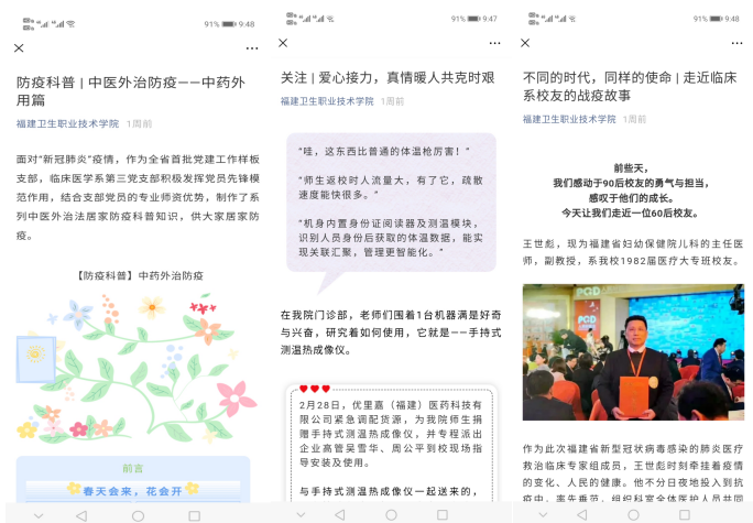 一、宣传教育组:1.通过QQ群、微信群、团学公众号等向师生及时传达学院有关防疫工作的重要会议、文件精神与防疫知识。2.对接相关支部,充分发挥专业特色,制作中医药的防疫宣传工作。3.对临床系团总支组织学生线上学习习近平总书记回信精神进行宣传报道。4.对教师集中学习党的十九届四中全会精神集进行宣传报道。5.对卫生防疫组联合门诊部开展捐赠活动进行宣传报道。6.对临床医学系校友抗击疫情的故事进行宣传报道。