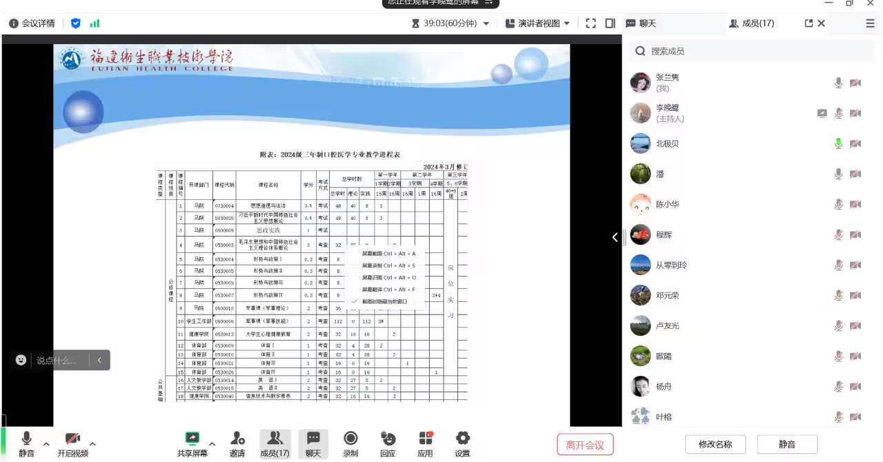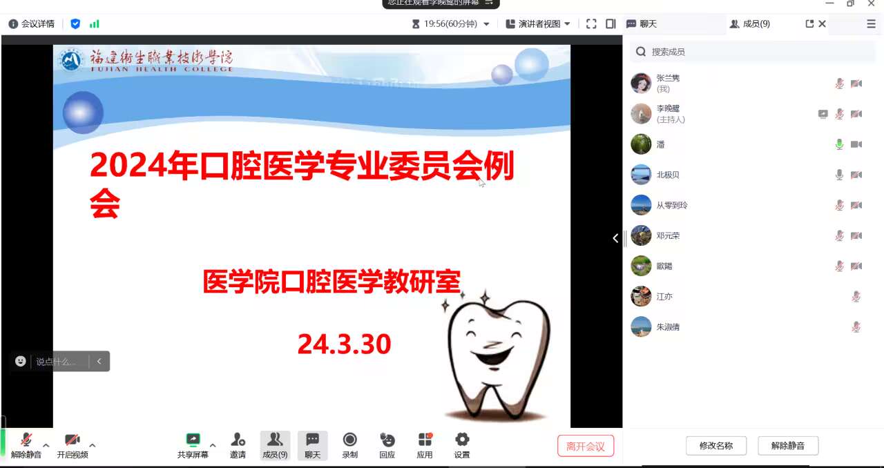 为进一步加强口腔医学专业建设,提升口腔医学专业人才培养质量,医学院口腔教研室于3月30日以线上方式召开口腔医学专业指导委员会2024年例会。原福建省级机关医院副院长潘在兴,原福建医科大学附属口腔医院院长卢友光、副院长程辉,福建医科大学附属协和医院口腔科副主任欧阳奇明,福建医科大学附属第一医院口腔科魏斌,福建省级机关医院口腔科主任陈小华、副主任郑艾荣,医学院副院长邓元荣及口腔医学教研室全体教师参加会议。