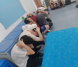 二是应急逃生演练(消防、地震)。安全工作处林泽文老师详细介绍消防器材使用、疏散信号、疏散路线、疏散顺序等注意事项,并强调在疏散过程中切勿拥挤、推搡导致踩踏事件发生。演练工作组接到演练指令后,燃放烟雾,迅速开启实训室的安全出口大门,组织学生弯腰、捂口鼻、无人喧哗、迅速有序地撤出实训室,按照指定路线,从楼梯通道内侧撤离,到空旷位置集合并清点人数。