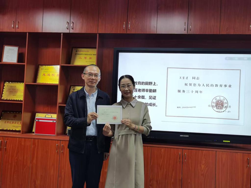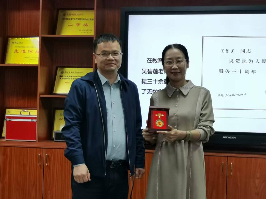 最后,傅衍达书记和邓元荣院长分别为吴碧莲老师颁发从教荣誉证书和退休纪念章,全体教职工以热烈掌声向这位坚守初心的教育者致以最高敬意。