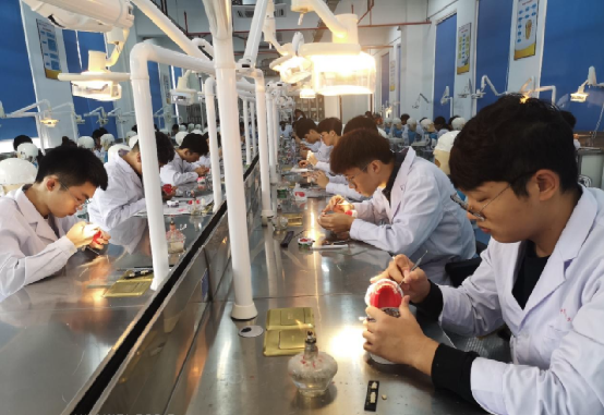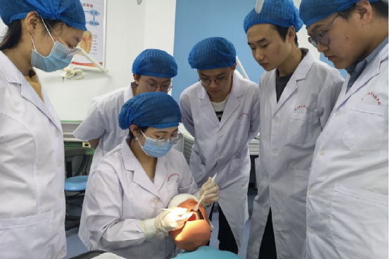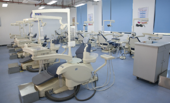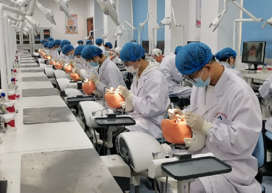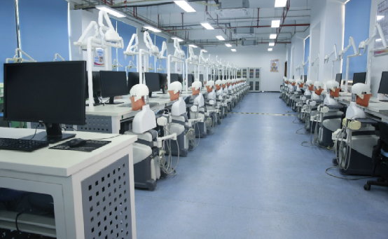 校内实训基地面积达700㎡,包含口腔综合实训室、口腔模拟诊室、口腔修复工艺室及门诊部口腔科等,拥有100套对接临床的仿头模教学系统,教学设备总值为800多万元,为学生开展各项实训对接口腔临床工作任务提供坚实的基础。