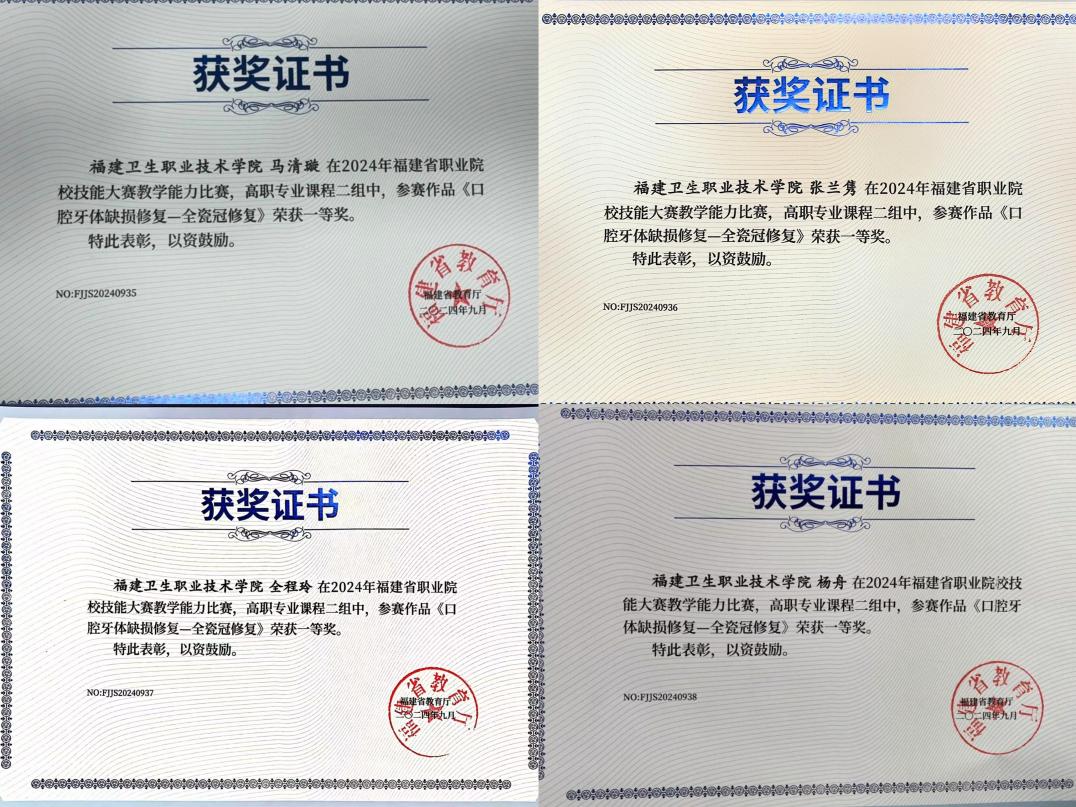 近年来,学生在口腔医学各级各类技能大赛上共获42个奖项,包括国际银奖1项、全国金奖1项、全国一等奖10项、全国团体第一名2项、省级团体第一名1项。学生获第五届国际口腔技师学术大会(韩国)口腔医学技术专业石膏牙雕刻银奖(第二名),是第一个在该项国际比赛中获奖的中国学生,实现了中国零的突破。