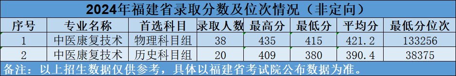 校内实训拥有中医康复实训室、针灸推拿实训室、康复实训基地、中医实训室等供教学需要。校外实习拥有包括福建省立医院、福建医科大学附属协和医院、福建中医药大学附属人民医院、福建中医药大学附属第二人民医院、福建中医药大学附属第三人民医院、福州市中医院、福州市第二医院等遍布全省二甲以上的30多所医院承担学生岗位实习的教学任务。