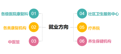 各级各类康复医疗中心/医院/门诊、社区服务中心/卫生院(所)、综合医院康复医学科、中医馆、中医健康管理机构、医养结合中心、养老服务机构、儿童康复机构、运动康复中心、产后康复中心、特殊教育学校、民政康复中心、儿童福利院、假肢矫形康复中心、美容机构、康复器械企业等从事康复治疗与服务等工作。近三年毕业生整体就业率达到95%。