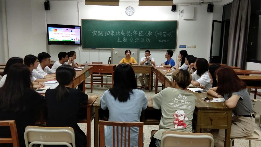 为不断深化习近平新时代中国特色社会主义思想的学思践悟,响应组织青年学生结合社会实践学习,9月15日晚,我系团总支于教学楼305开展了一场“实践归来话成长:年轻人要‘自讨苦吃’”主题交流活动。团总支陈清清老师、谢林辉老师以及三下乡各队伍成员参加了此次交流会。