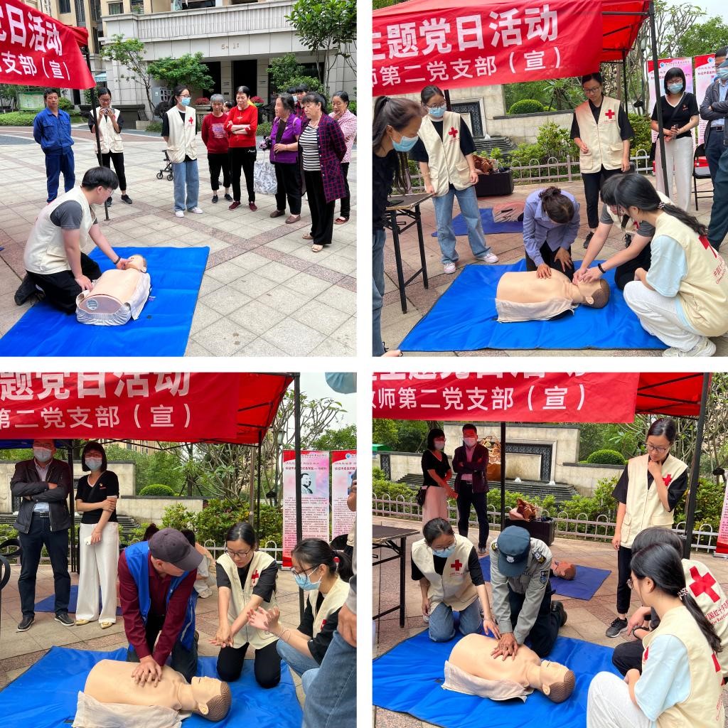 在医学院教师第二党支部党员教师的指导下,医学院红十字会的同学们还开展了急救知识宣传和现场心肺复苏术技能培训,吸引了保安师傅、物业大姐、社区居民、青少年等各类人群前来参与。