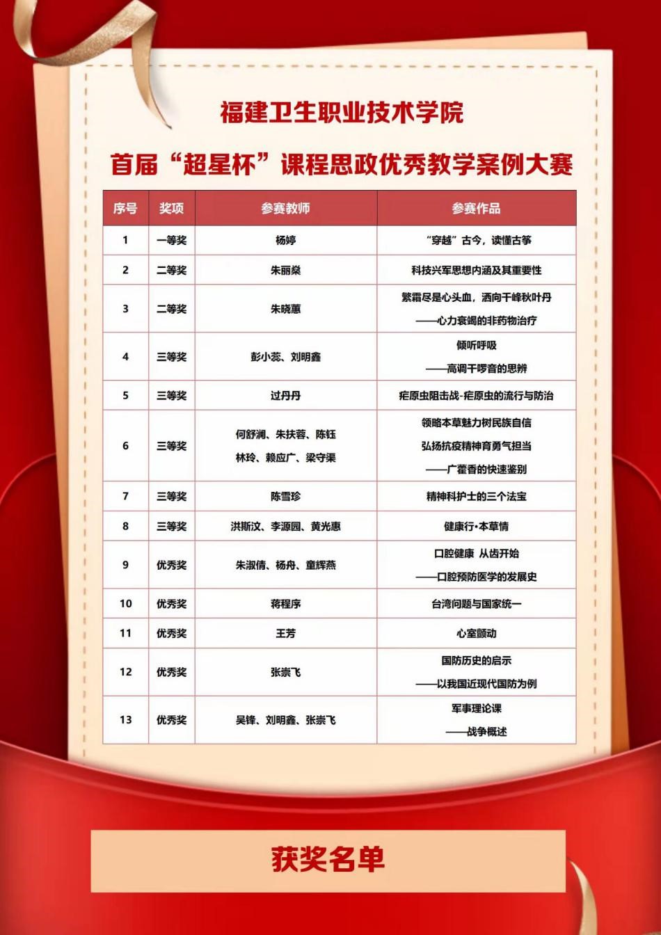 为更好地深入贯彻落实习近平总书记关于教育的重要论述和全国教育大会精神,贯彻落实教育部《高等学校课程思政建设指导纲要》,医学院老师积极探索实践,深入挖掘课程中蕴涵的思政元素,融入课程教学中,2021年11月多位老师参加了首届“超星杯”课程思政优秀教学案例大赛,在全国143所职业院校、600多个参赛团队作品中脱颖而出,朱晓蕙、彭小蕊、刘明鑫、朱淑倩、杨舟、童辉燕、王芳等7位老师分别斩获二等奖1项、三等奖1项、优秀奖2项。