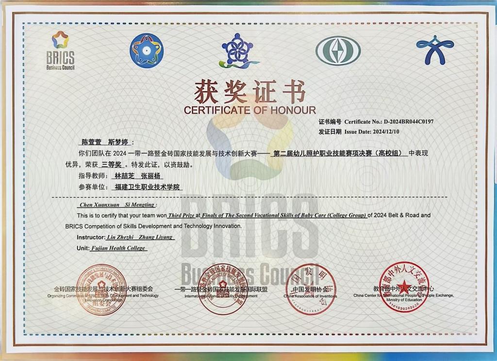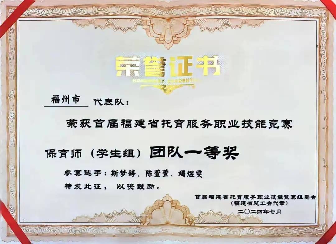 实习基地广泛:婴幼儿托育服务与管理专业与福州市亲亲袋鼠托育服务有限公司、贝悠童托育服务有限公司、厦门市思明教育投资有限公司、闽侯县小鹿萌萌托育服务有限公司、贝蒙考拉托育服务有限公司等多家托育机构、医院儿童保健中心建立深度融合共育人才培养机制,为专业的实习提供坚实保障,实现从校园到职场的无缝衔接。培养人才优秀:专业人才培养成效显著,学生在各级技能竞赛中屡获佳绩。荣获国赛二等奖2项、三等奖3项,省赛一等奖5项、二等奖4项、三等奖7项。